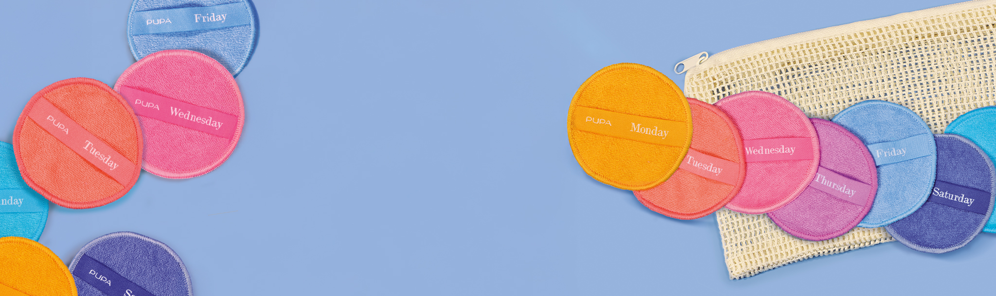 A Pad A Day este setul cu 7 dischete demachiante reutilizabile din bumbac Pupa Milano, câte una pentru fiecare zi a săptămânii, cu săculeț de protecție pratic.